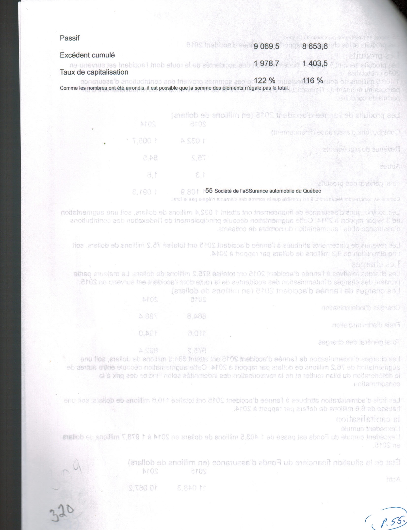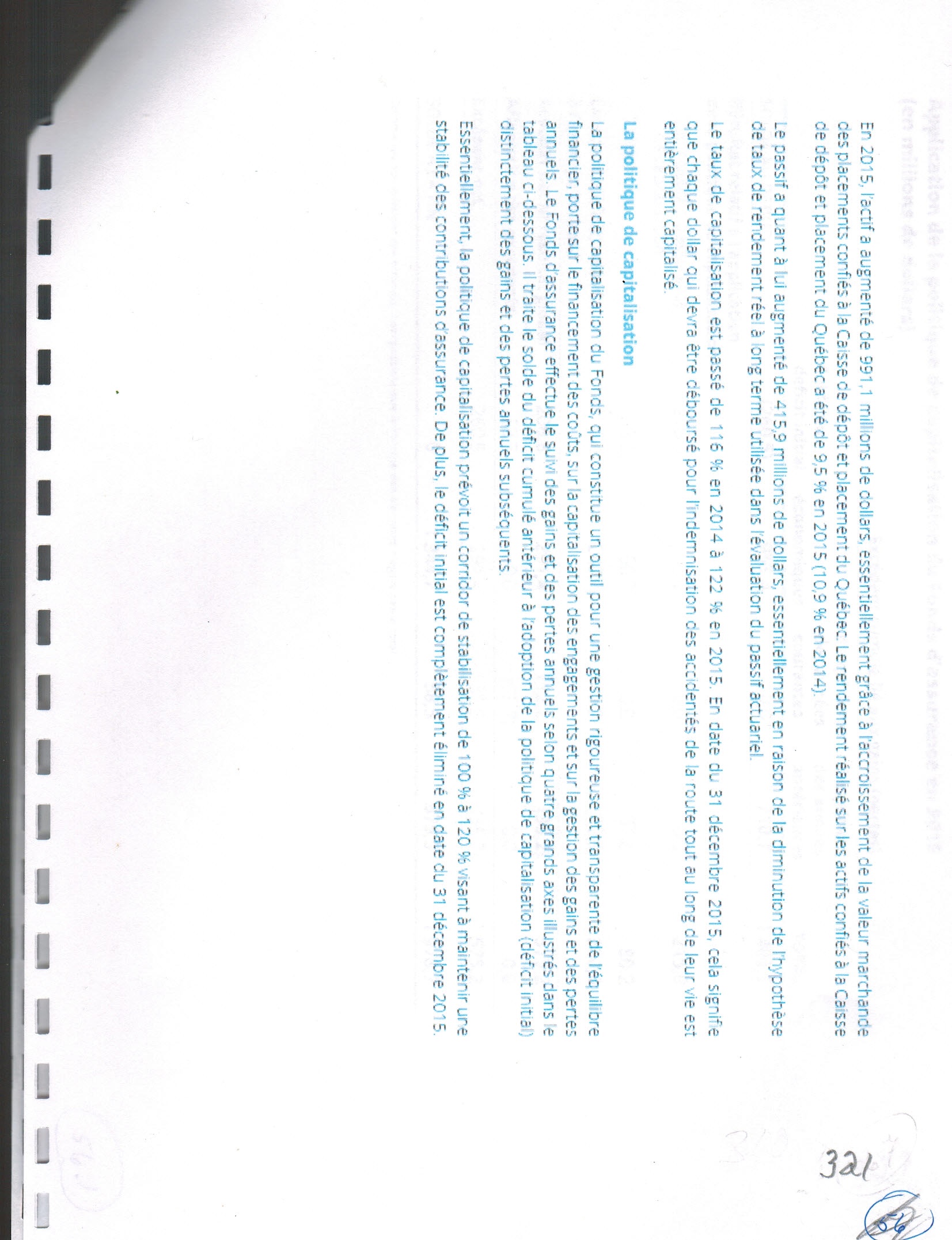 Le taux de capitalisation est passé de 116 gs.E, en 2014 à 122 % en 2015. En date du 31 décembre 2015, cela signif e due chaque dollar qui devra être déboursé pour l'indemnisation des accidentés de la route tout au long ce leur vie est entièrement capitalisé.