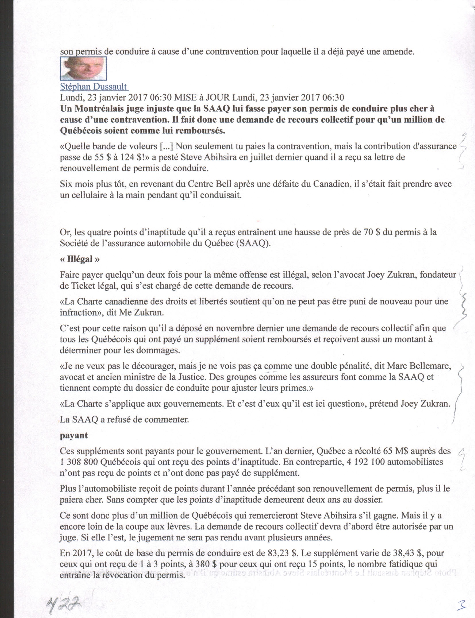 Or, les quatre points d'inaptitude qu'il a reçus entraînent une hausse de près de 70 $ du permis à la Société de l'assurance automobile du Québec (SAAQ). « Illégal » Faire payer quelqu'un deux fois pour la même offense est illégal, selon l'avocat Joey Zukran, fondateur de Ticket légal, qui s'est chargé de cette demande de recours. «La Charte canadienne des droits et libertés soutient qu'on ne peut pas être puni de nouveau pour une infraction», dit Me Zukran. C'est pour cette raison qu'il a déposé en novembre dernier une demande de recours collectif afin que tous les Québécois qui ont payé un supplément soient remboursés et reçoivent aussi un montant à déterminer pour les dommages. «Je ne veux pas le décourager, mais je ne vois pas ça comme une double pénalité, dit Marc Bellemare, avocat et ancien ministre de la Justice. Des groupes comme les assureurs font comme la SAAQ et tiennent compte du dossier de conduite pour ajuster leurs primes.» «La Charte s'applique aux gouvernements. Et c'est d'eux qu'il est ici question», prétend Joey Zukran. La SAAQ a refusé de commenter.