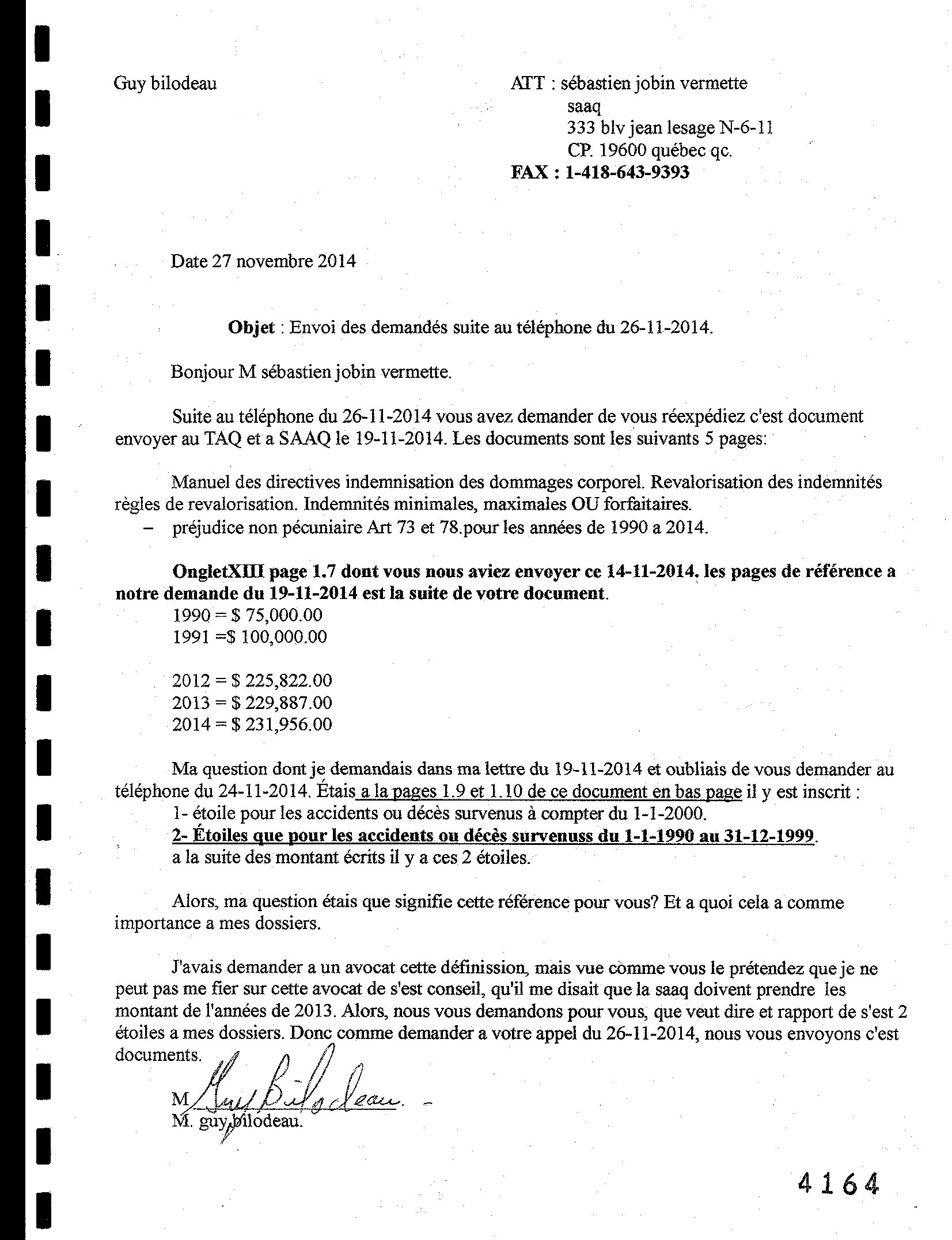 Suite au téléphone du 26-11-2014 vous avez demander de vous réexpédiez c'est document envoyer au TAQ et a SAAQ le 19-11-2014. Les documents sont les' suivants 5 pages: