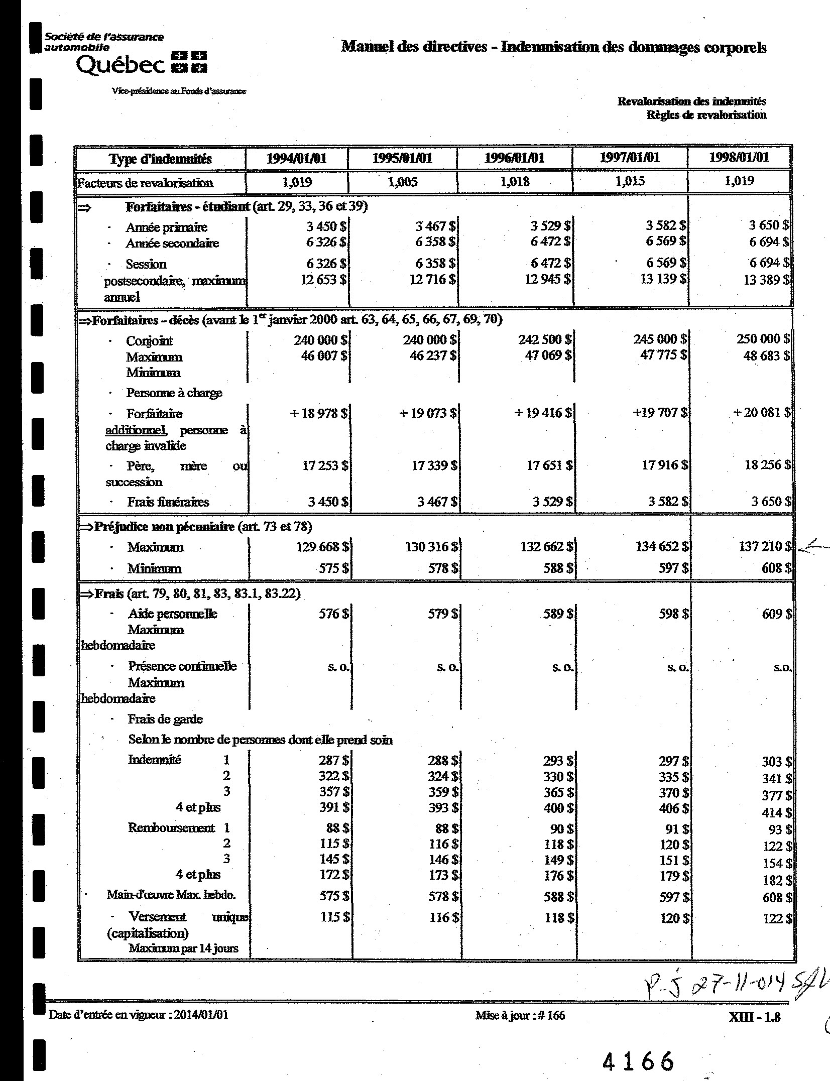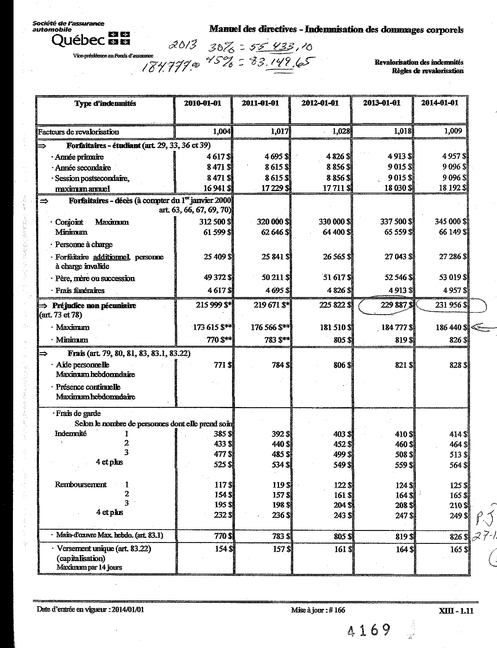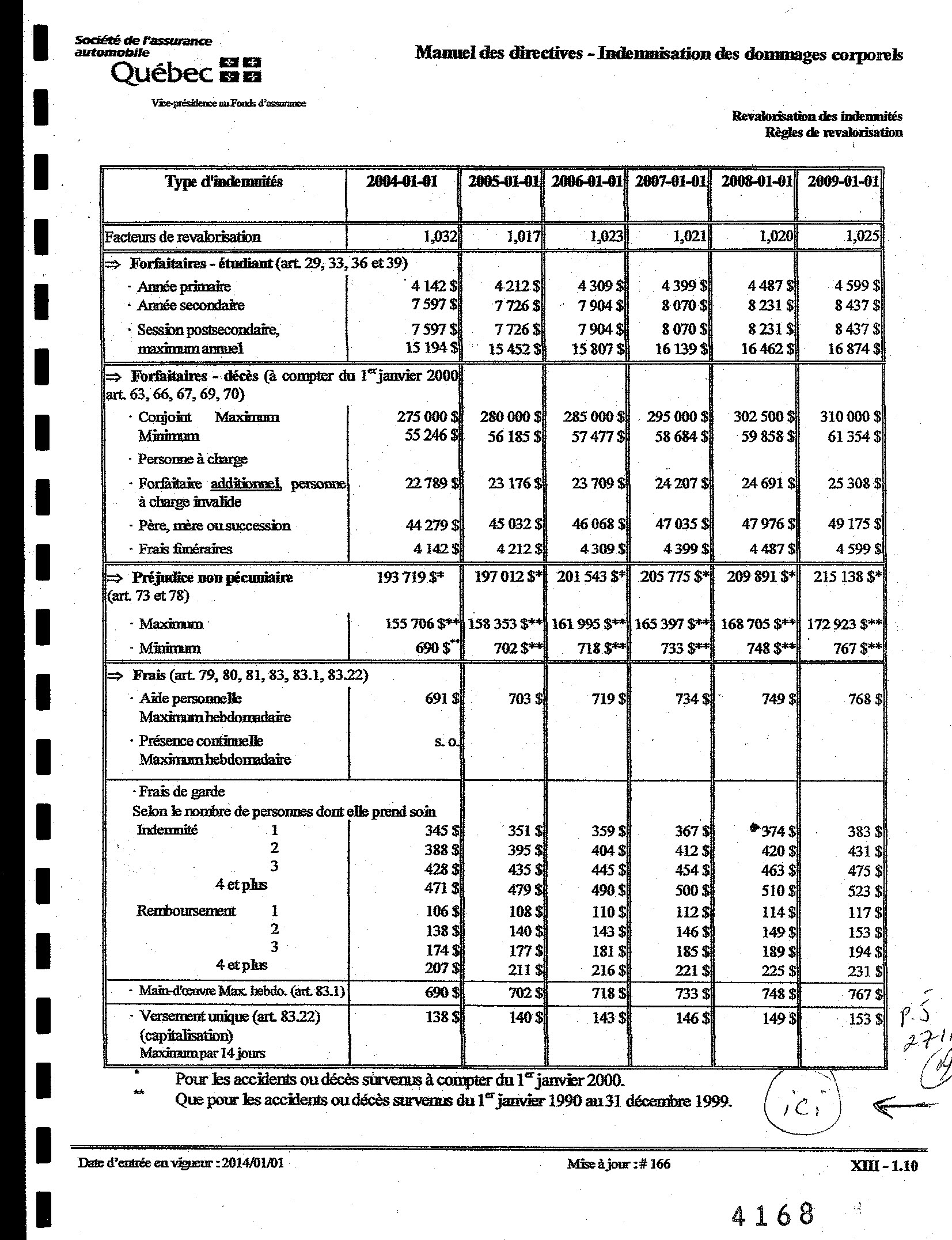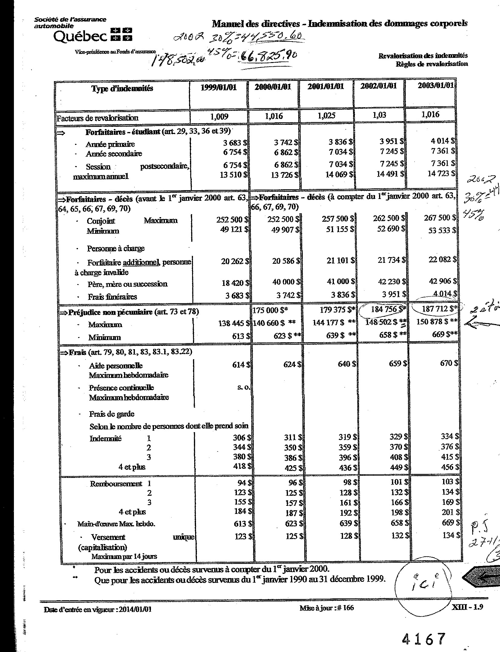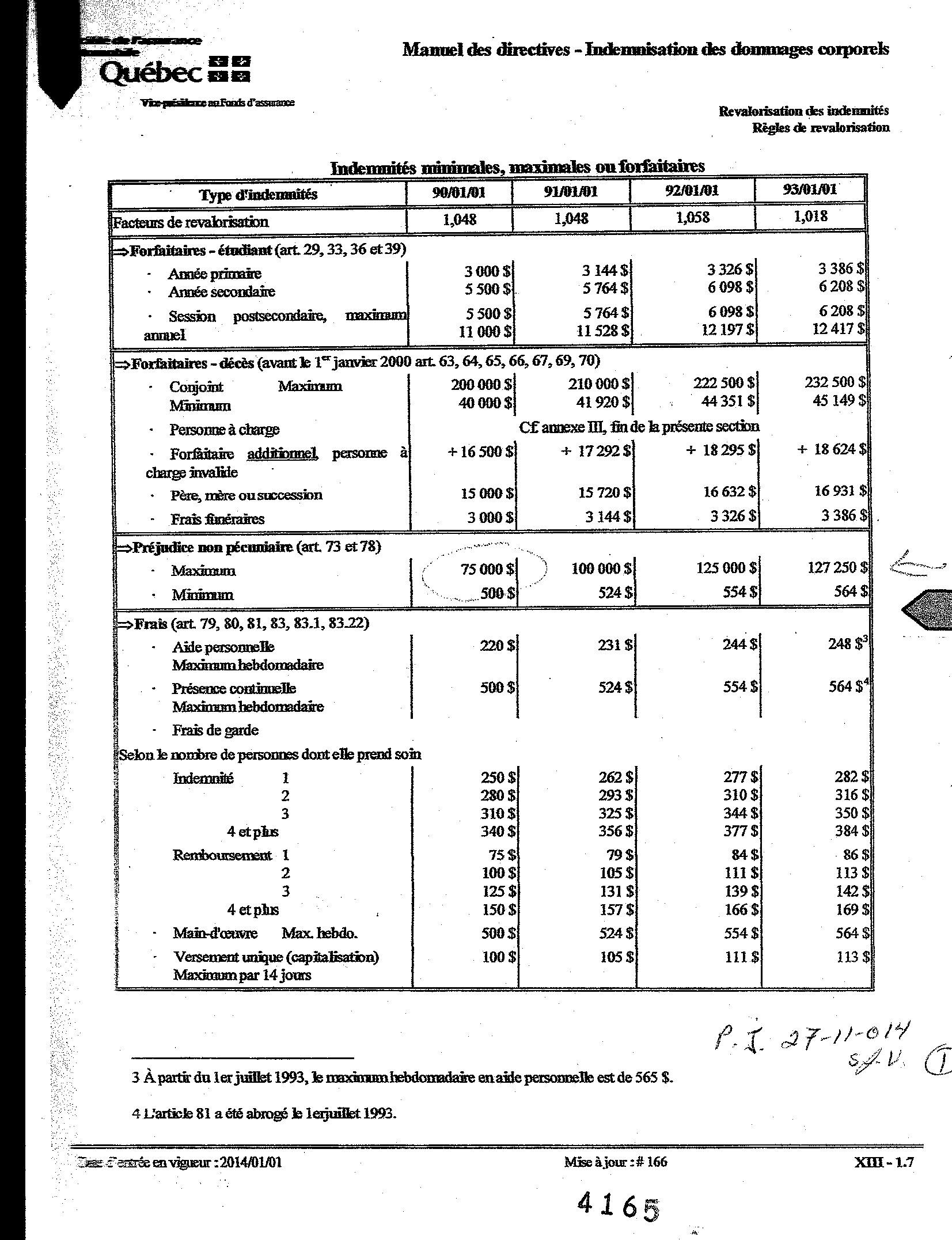 Manuel des directives indemnisation des dommages corporel. Revalorisation des indemnités règles de revalorisation. Indemnités minimales, maximales OU forfaitaires. — préjudice non pécuniaire Art 73 et 78.pour les années de 1990 a 2014.