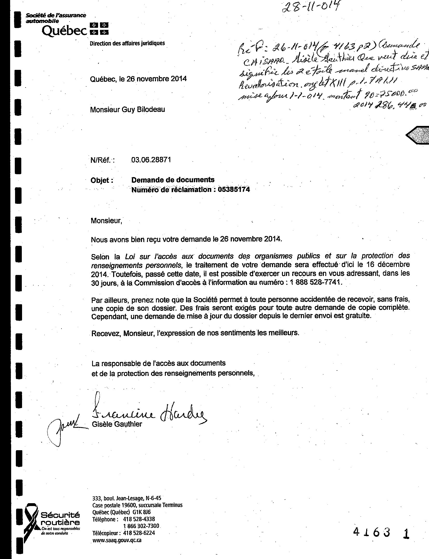 Direction des affaires juridiques Québec, le 26 novembre 2014 Monsieur Guy Bilodeau