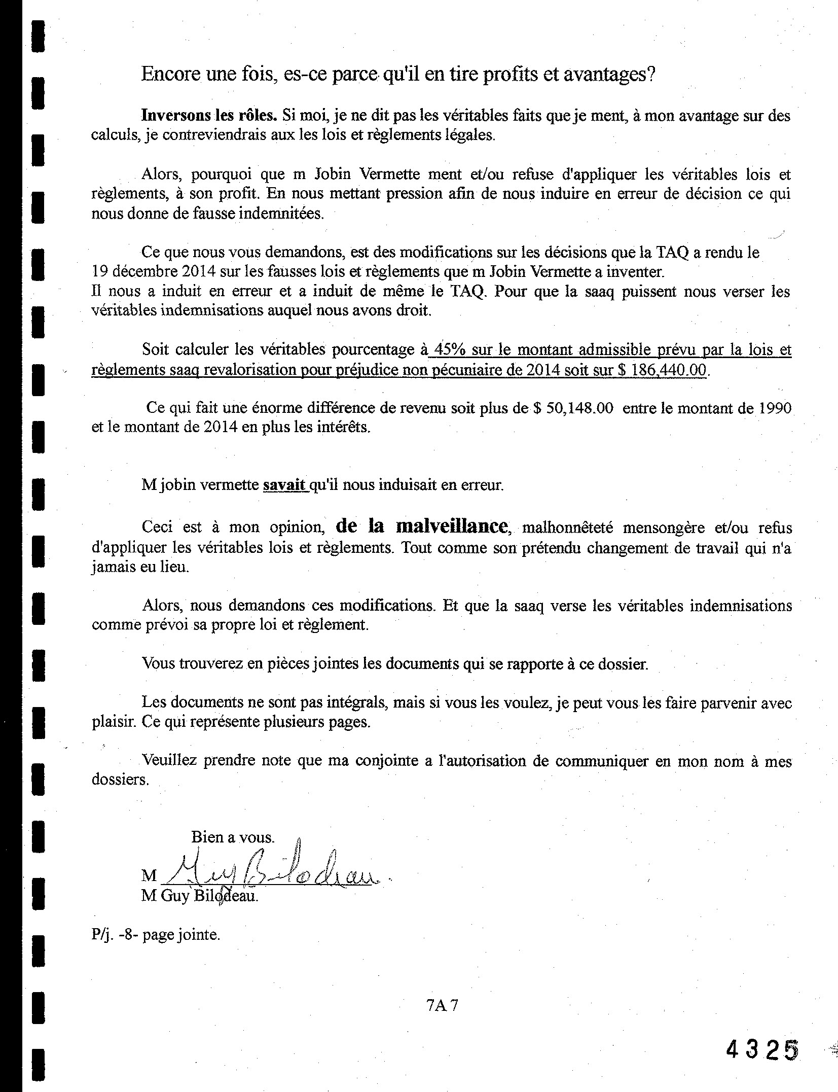 Ce que nous vous demandons, est des modifications sur les décisions que la TAQ a rendu le 19 décembre 2014 sur les fausses lois et règlements que m Jobin Vermette a inventer. Il nous a induit en erreur et a induit de même le TAQ. Pour que la saaq puissent nous verser les véritables indemnisations auquel nous avons droit. Soit calculer les véritables pourcentage à 45% sur le montant admissible prévu par la lois et règlements saaq revalorisation pour préjudice non pécuniaire de 2014 soit sur $ 186,440.00.