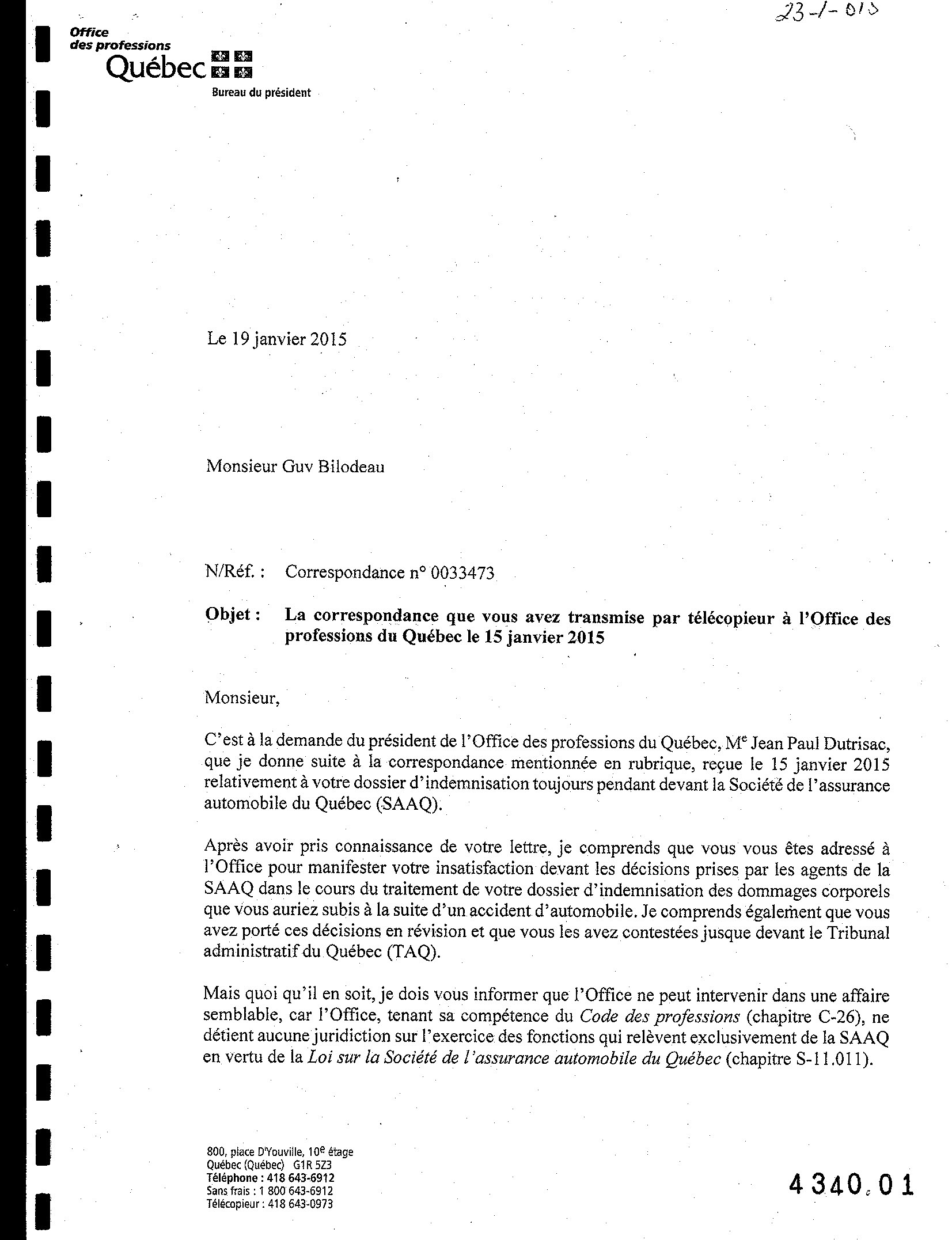 C'est à la demande du président de l'Office des professions du Québec, Me Jean Paul Dutrisac, que je donne suite à la correspondance mentionnée en rubrique, reçue le 15 janvier 2015 relativement à votre dossier d'indemnisation toujours pendant devant la Société de l'assurance automobile du Québec (SAAQ).