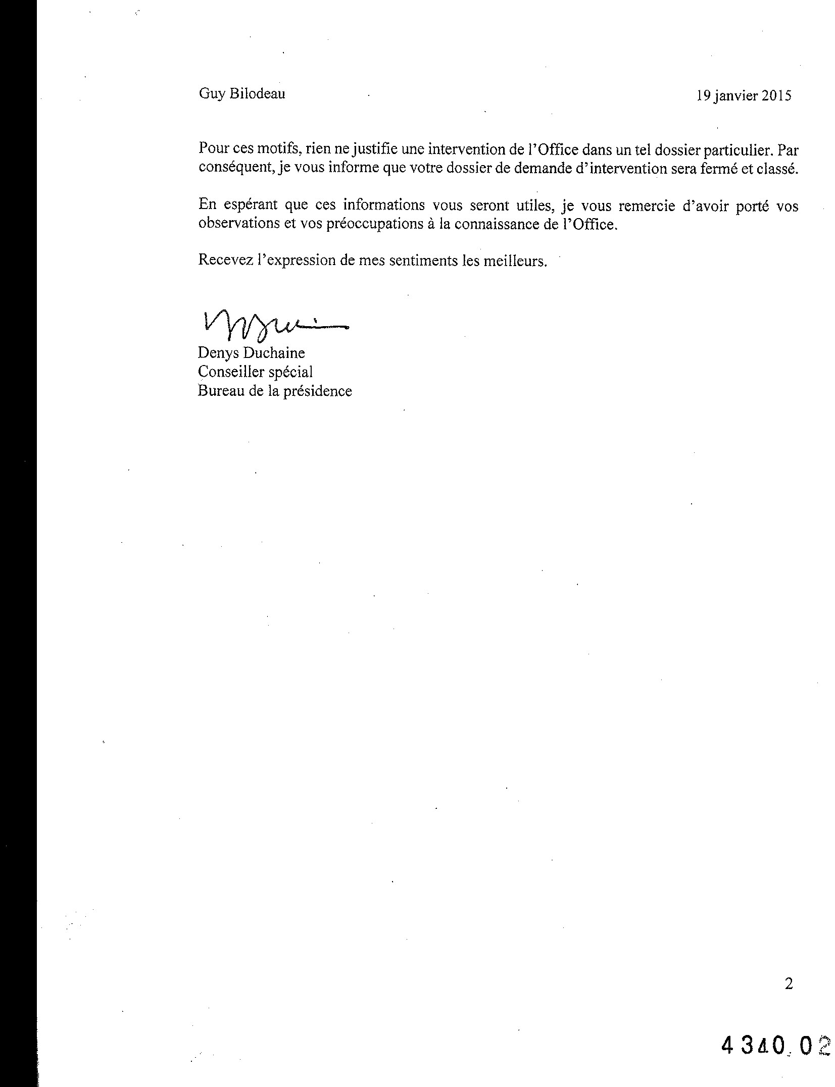 Pour ces motifs, rien ne justifie une intervention de l'Office dans un tel dossier particulier. Par conséquent, je vous informe que votre dossier de demande d'intervention sera fermé et classé.