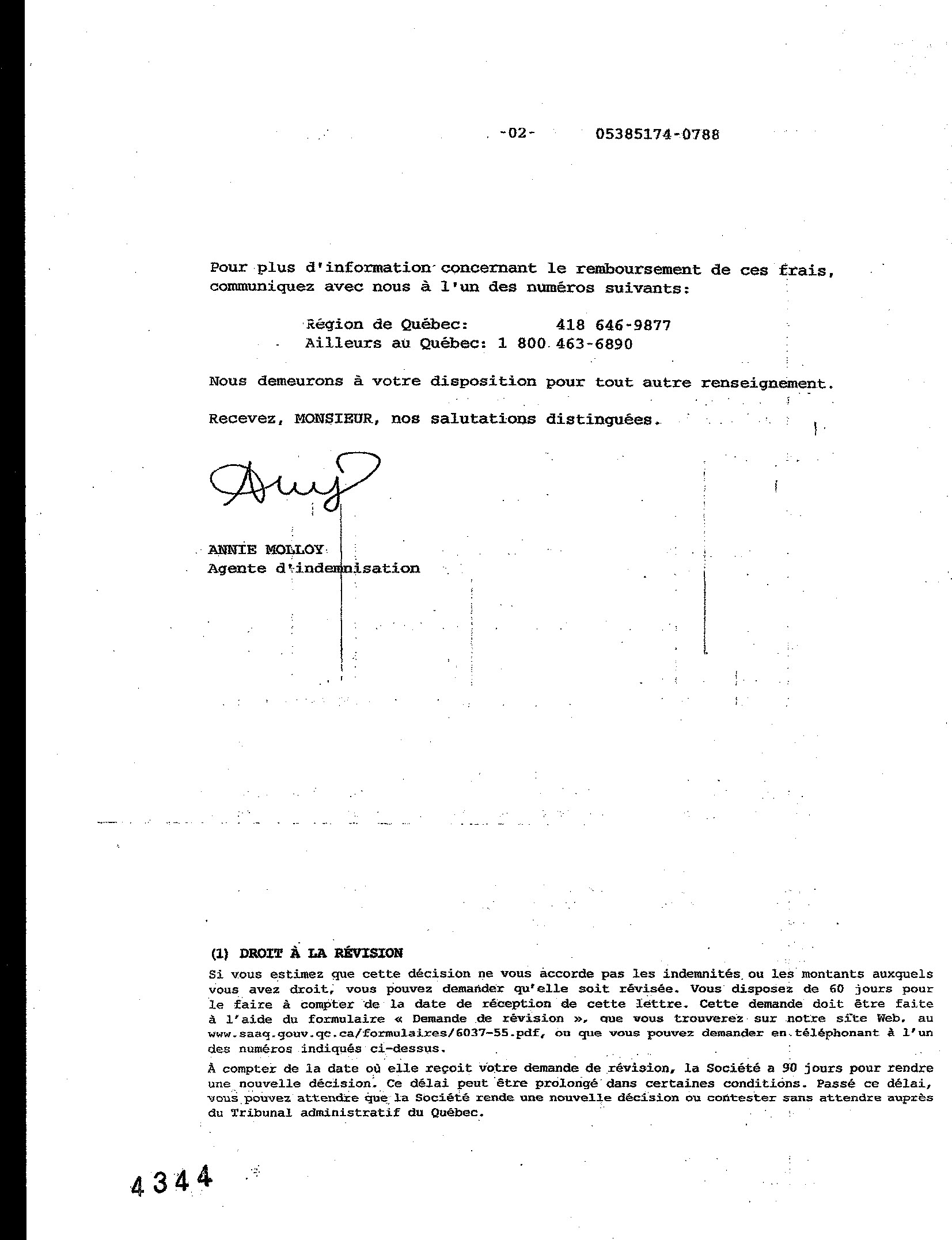 (1) DROIT À LA RÉVISION Si vous estimez que cette décision ne vous accorde pas les indemnités_ou les montants auxquels Vous avez droit; vous pouvez demander qu'elle soit révisée. Vous disposez de 60 jours pour le faire à compter de la date de réception de cette lettre_ Cette demande doit être faite à l'aide du formulaire « Demande de révision », eue vous trouverez sur motte srte Web. au www-saaq.gouv.qc.caiformulaires/6017-55_pdf, ou que vous pouvez demander entéléphonant à l'un des numéros indiqués ci-dessus. • • A compter de la date où elle reçoit votre demande de révision, la Société a 90 jours pour rendre une nouvelle décision. Ce délai peut 'être prOlongé'dans certaines conditiOns. Passé ce délai, vous pouvez attendre que, la Société rende une nouvelle décision ou contester sans attendre auprès du Tribunal administratif du Québec.