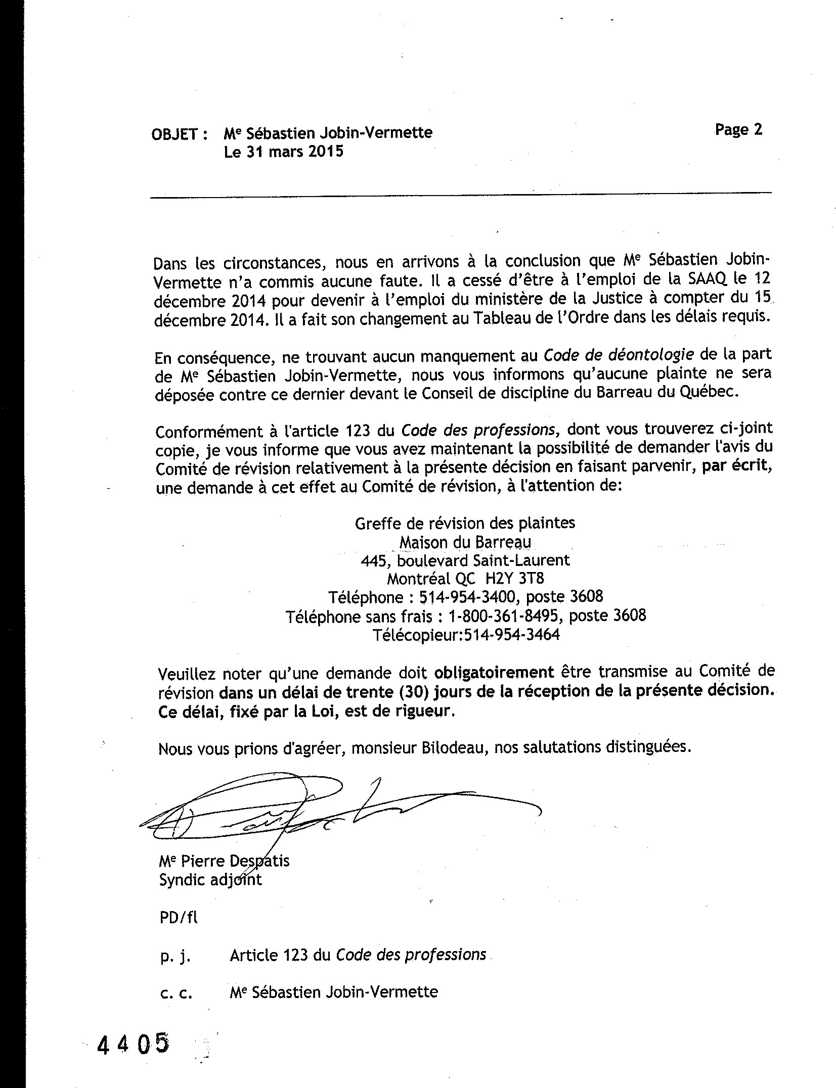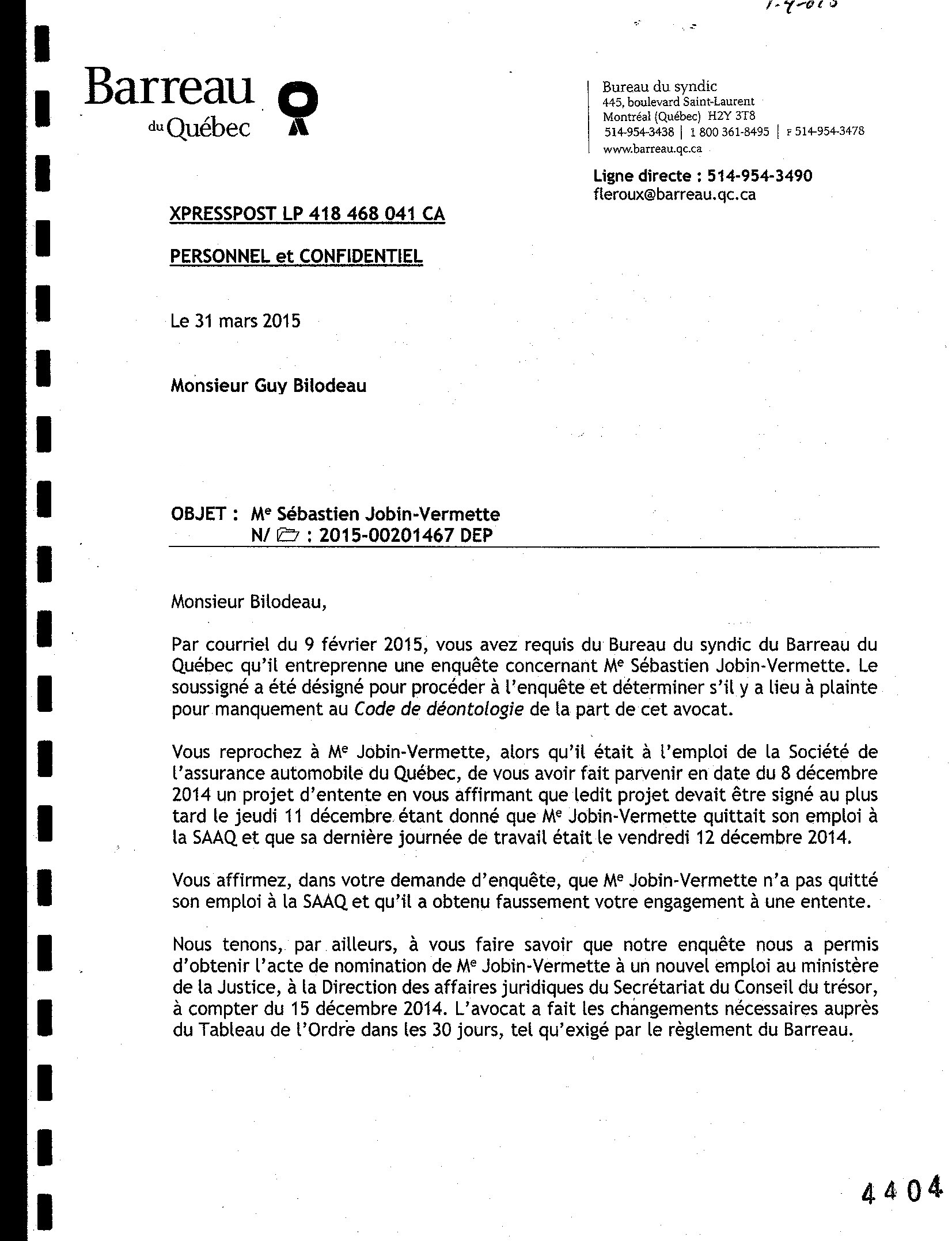 Nous tenons, par ailleurs, à vous faire savoir que notre enquête nous a permis d'obtenir l'acte de nomination de Me Jobin-Vermette à un nouvel emploi au ministère de la Justice, à la Direction des affaires juridiques du Secrétariat du Conseil du trésor, à compter du 15 décembre 2014. L'avocat a fait les changements nécessaires auprès du Tableau de l'Ordrè dans Les 30 jours, tel qu'exigé par le règlement du Barreau.