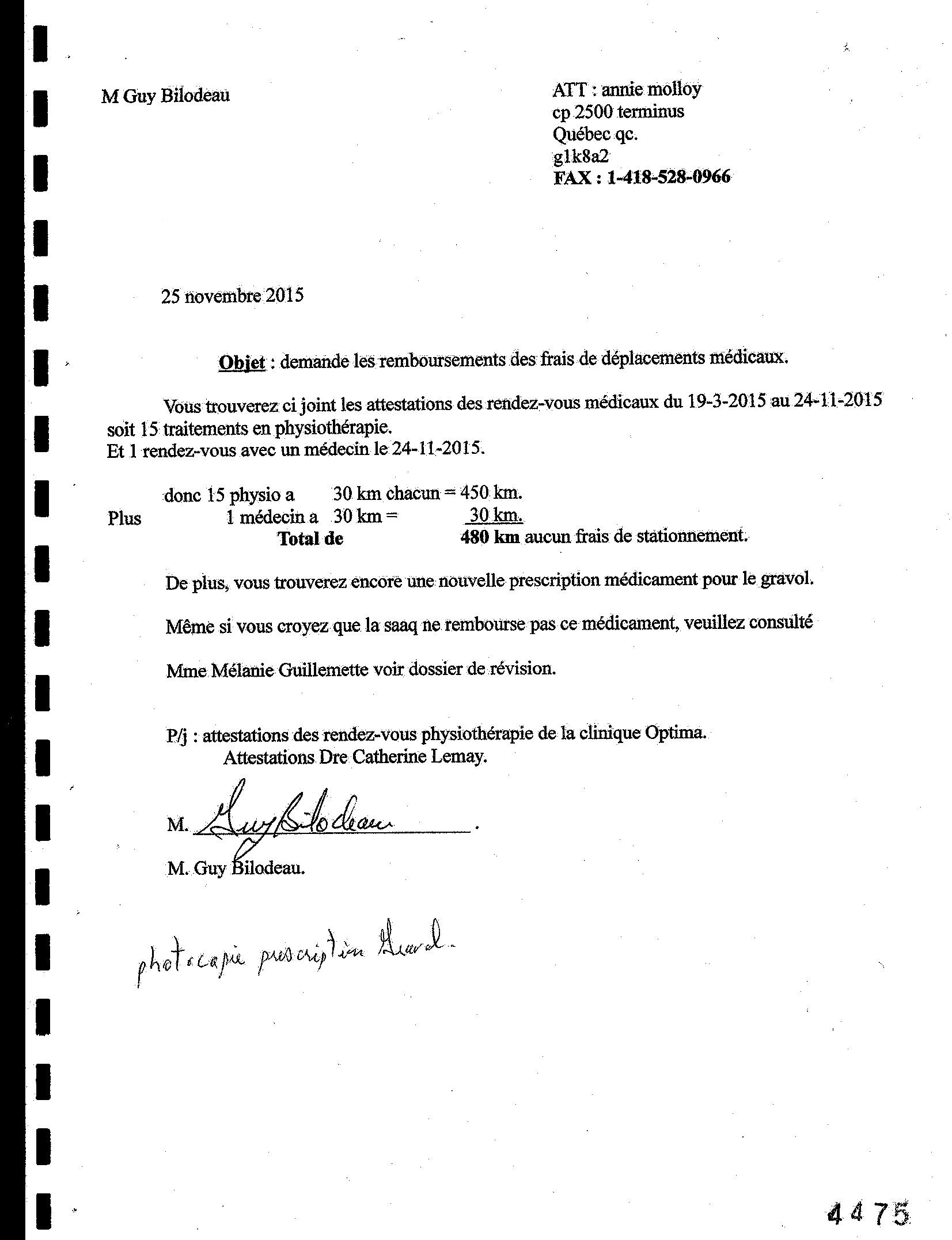 Objet:: demande le remboursements des frais de déplacements médicaux. Vous trouverez ci joint les attestations des rendez-vous médicaux du 19-3-2015 au 24-11-2015 soit 15 traitements en physiothérapie. Et 1 rendez-vous avec un médecin le 24-11-2015.