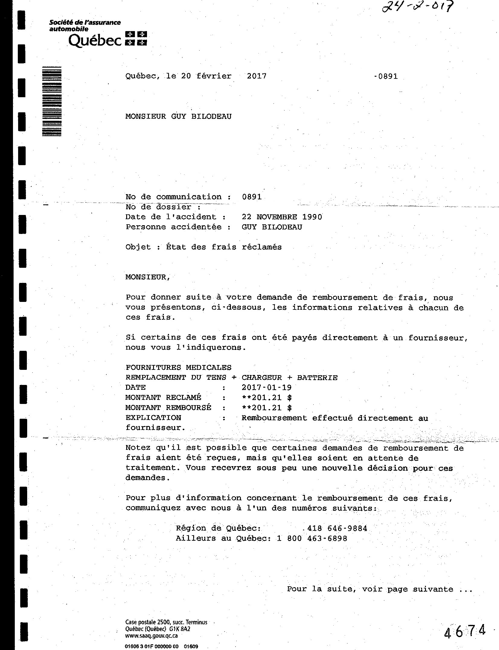 CHARGEUR + BATTERIE 2017-01-19 **201.21 $ **201.21 $ Remboursement effectué directement au fournisseur.