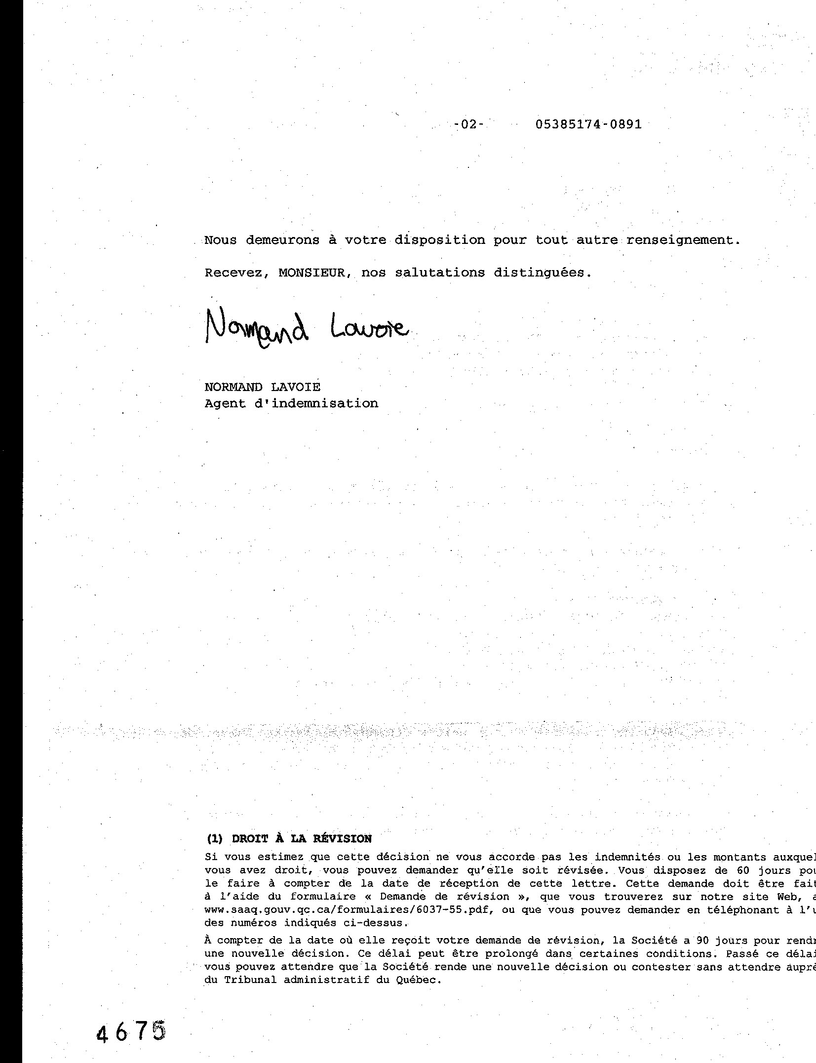(1) DROIT À LA RÉVISION Si vous estimez que cette décision ne vous accorde pas les indemnités ou les montants auxque] vous avez droit, vous pouvez demander qu'elle soit révisée. Vous disposez de 60 jours pot le faire à compter de la date de réception de cette lettre. Cette demande doit être fait à l'aide du formulaire « Demande de révision », que vous trouverez sur notre site Web, www.saaq.gouv.qc.ca/formulaires/6037-55.pdf, ou que vous pouvez demander en téléphonant à l'un des numéros indiqués ci-dessus. À compter de la date où elle reçoit votre demande de révision, la Société a 90 jours pour rends une nouvelle décision. Ce délai peut être prolongé dans certaines conditions. Passé ce délai vous pouvez attendre que la Société rende une nouvelle décision ou contester sans attendre âuprè du Tribunal administratif du Québec.