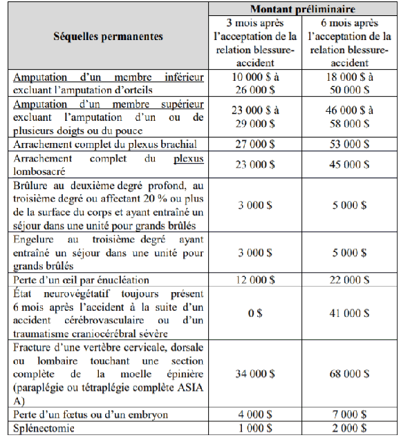 Une liste des séquelles pouvant donner droit à un paiement préliminaire a été établie. Le tableau qui suit présente ces séquelles, les montants préliminaires alloués et le moment de leur versement :