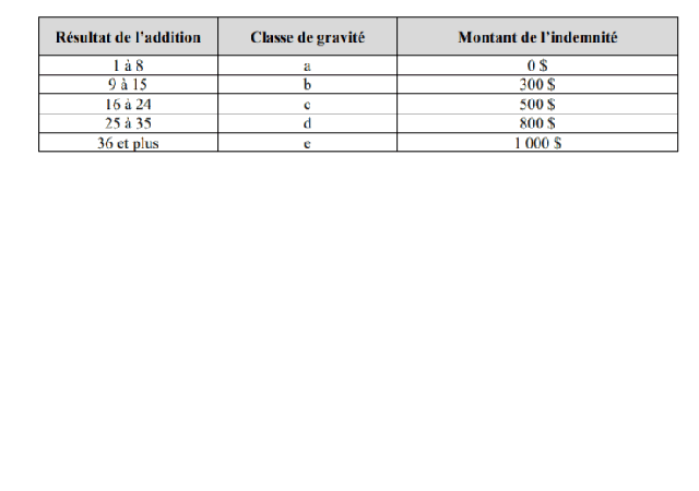 Le montant de l’indemnité forfaitaire accordé à la victime est le montant indiqué dans le tableau I correspondant à la classe de gravité déterminée. La classe de gravité b est le minimum requis pour donner droit à une indemnité.