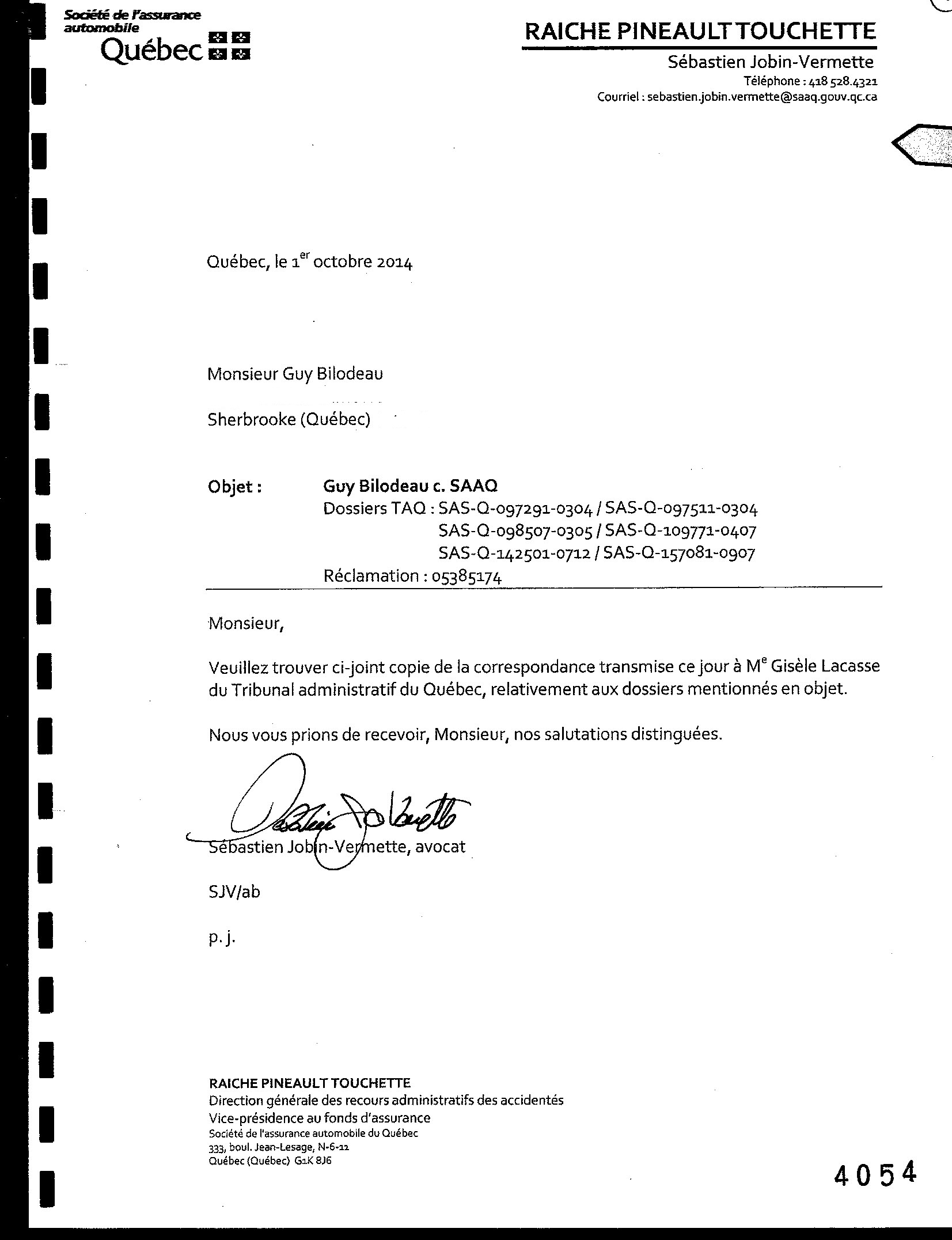 Objet : Guy Bilodeau C. SAAQ Dossiers TAO : SAS-Q-097291-0304 / SAS-Q-097511-0304 SAS-Q-098507-0305 / SAS-Q-109771-0407 SAS-Q-142501-0712 / SAS-Q-157081-0907 Réclamation : 05385174